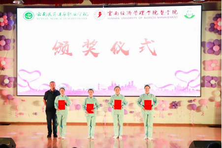 晚会第三项,由护理系教师给优秀学生代表毛思瑶等8人颁奖。